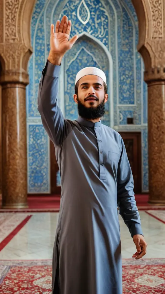 رجل مسلم ملتحي يرفع يديه يدعو إلى الله، في المسجد.