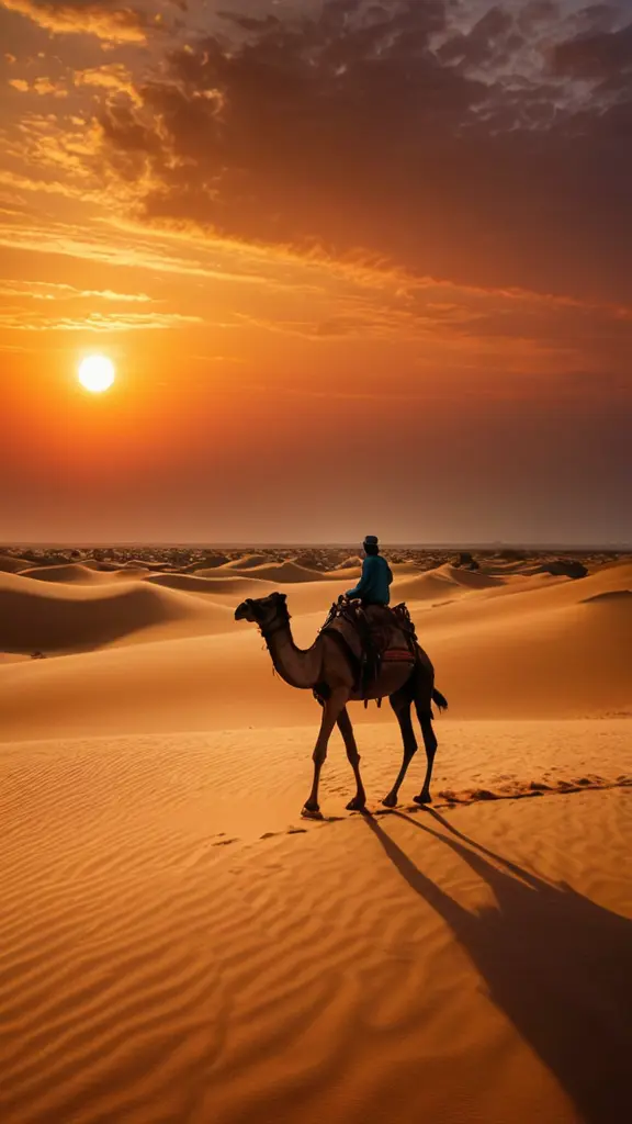رجل يقود جملًا وسط كثبان رملية ذهبية، مع شمس غروب ضخمة ملونة بالأحمر والبرتقالي في الخلفية. الغيوم تتخللها ألوان دافئة تغمر السماء، مع تفاصيل الظلال الممتدة على الرمال.