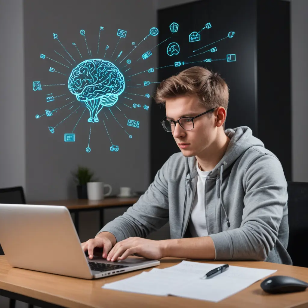 شاب مبرمج قاعد على مكتب قدام لابتوب تفكيره مشتت بكثير من الأشياء الأخرى