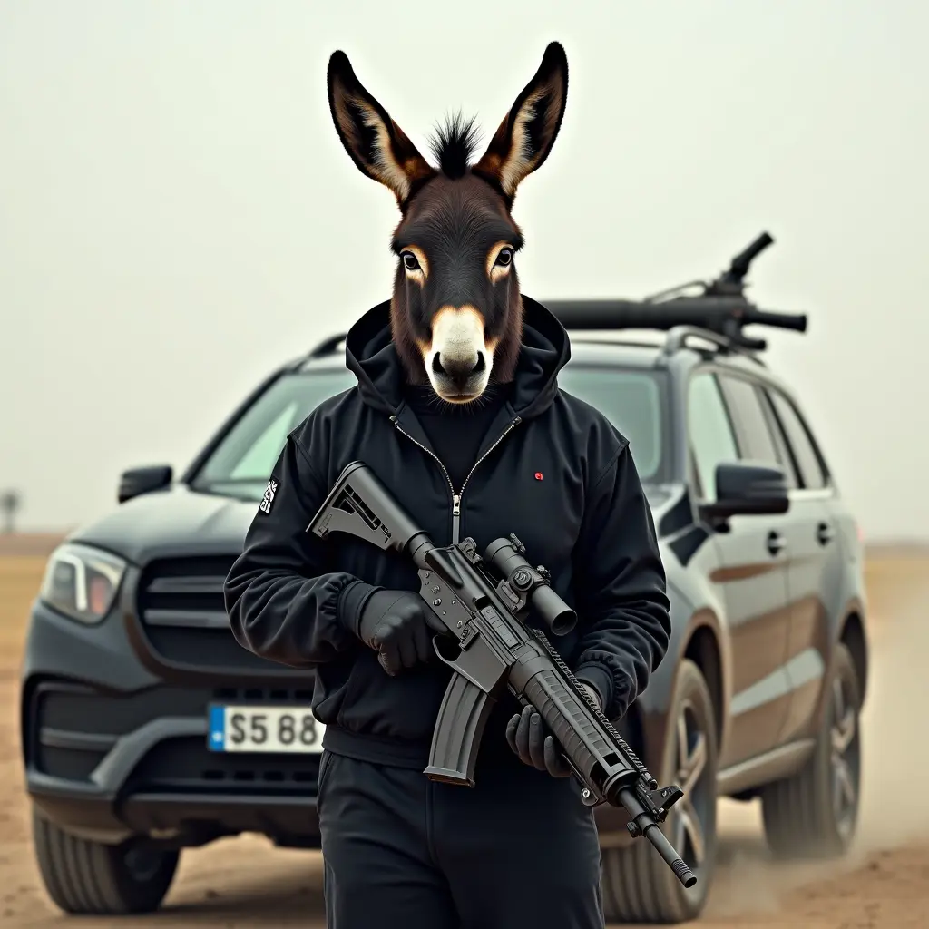 إنسان برأس حمار يحمل سلاح، يحمل سلاح كار، يحمله فوق، يرتدي بدلة شمس سوداء، وخلفه سيارة سوداء كبيرة، الصورة مستقيمة وواقعية