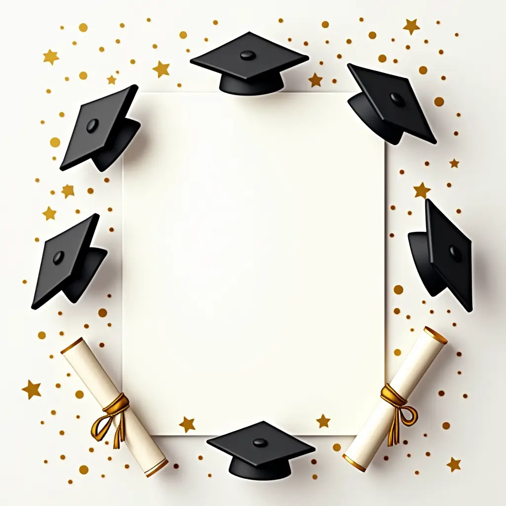 بطاقة، إطار من قبعات التخرج والدبلومة، مساحة مفتوحة في الوسط، ألوان كلاسيكية بالأبيض والذهبي، تفاصيل شرابة، نمط كونفيتي خفيف.