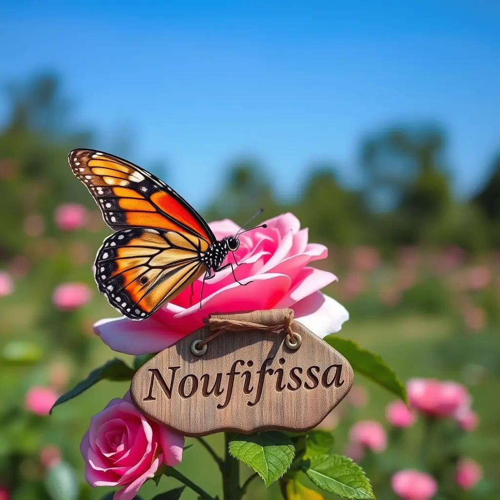 فراشة جميلة تقف على وردة جميلة مع اسم Noufissa محفور على شجرة
