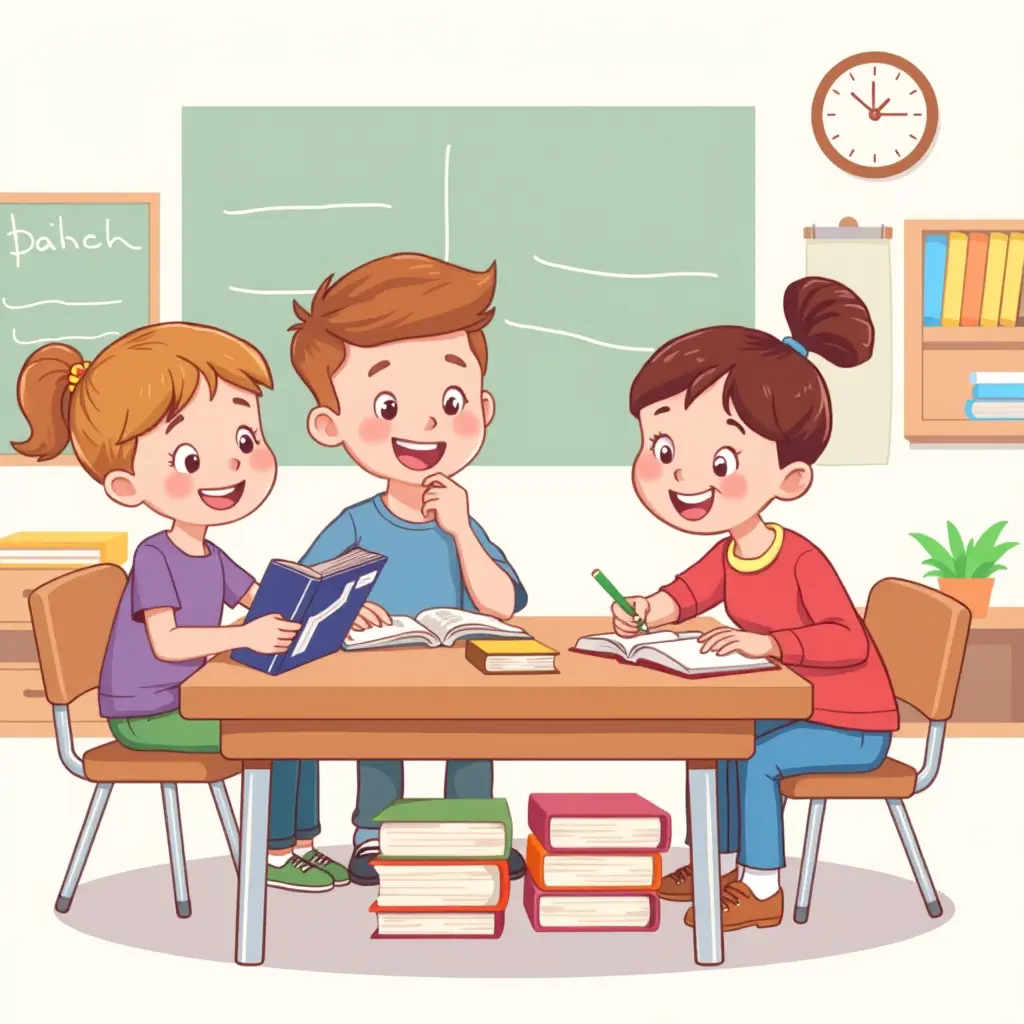 اريد صورة كرتونية لأطفال يتعاونون في الدراسة وحل الواجبات في الفصل الدراسي