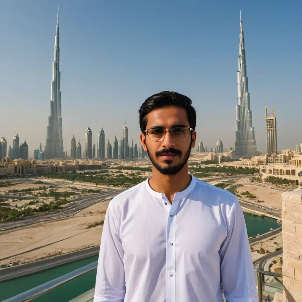 شاب عماني في عمر ال٢٠ لديه لحية كامله و خفيفه من الجوانب وتدريج إلى النصف تكون متوسطه و خدود كبيرة و يلبس نظارات و لديه حواجب كثيفه و بشره بيضاء و شعر متوسط طولة ١٧٠ و وزنة ٧٧ و يقف أمام برج خليفه و لديه شنب كبير صوره و هو يقف بعيد يقف بعيد رجوله واضحه
