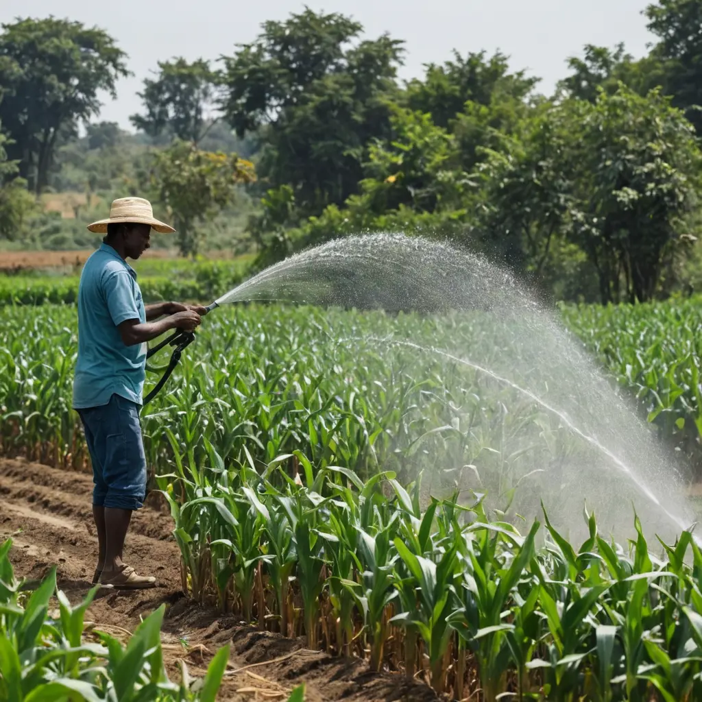 فلاح يروي الارض التي مزروعه ذره وفاصوليا