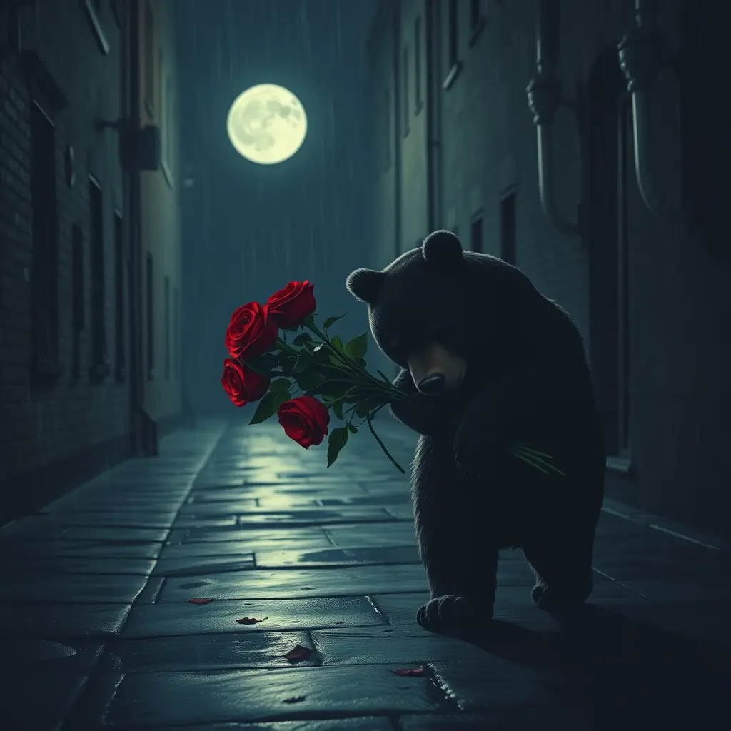 صوره ليليه لدب حزين يسحب باقه ورد احمر (اللون الاحمر ظاهر) يسير بين الأزقه والارض مبلوله من المطر مع اظهار القمر بشكل كامل. الصورة بلمسات حزن