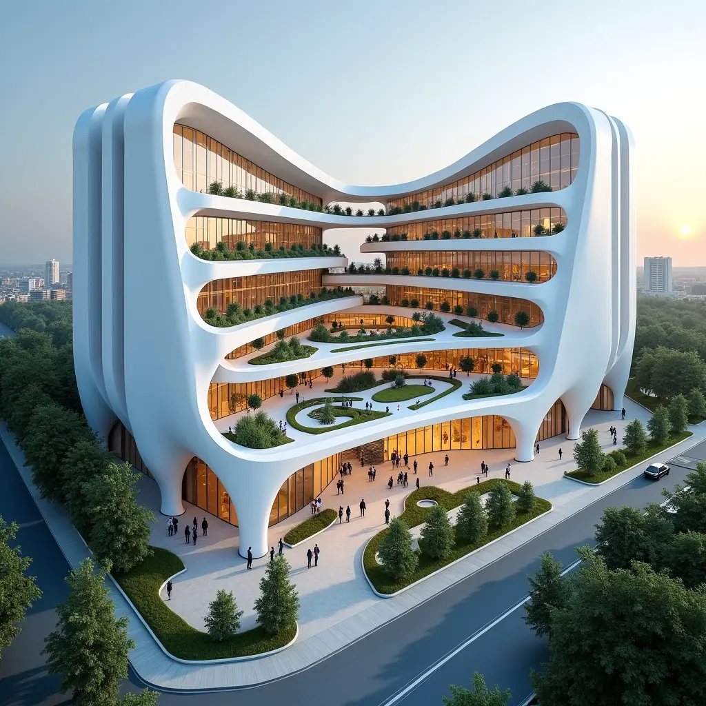 The design of the general teaching hospital is inspired by the function of the heart, where the central core (the heart) represents the main section, including the intensive care unit and emergency department. The medical wings (arteries) branch out smoothly toward different departments, with fluid pathways resembling capillaries to ensure seamless movement. Flowing curves and transparent facades are used to reflect biological dynamism, along with internal courtyards and green spaces to enhance healing.