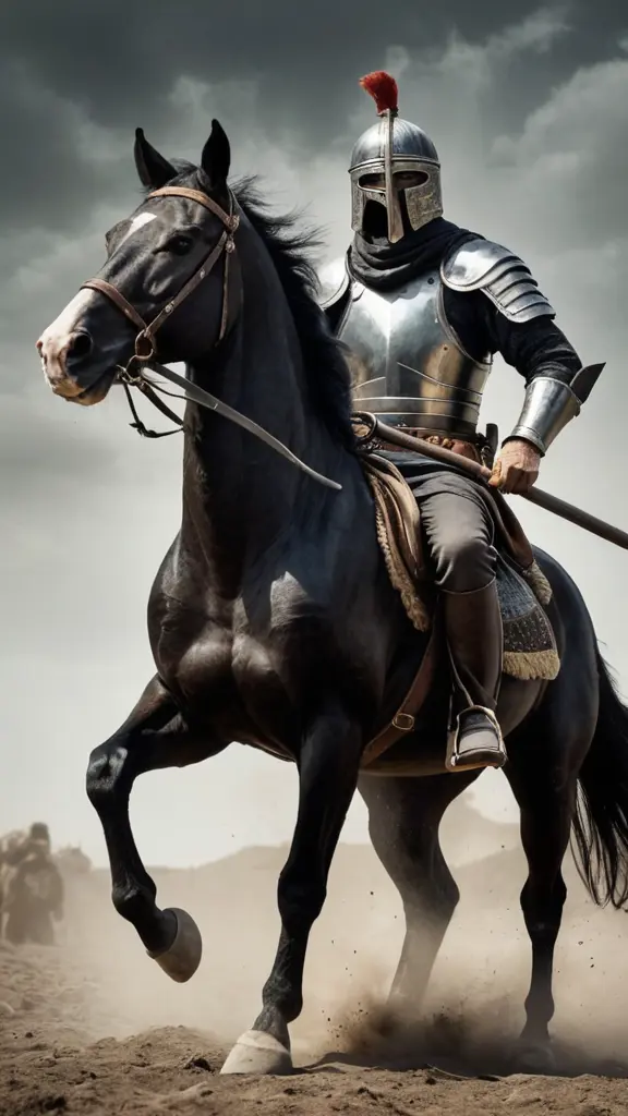 صورة ذكية لمحارب شجاع مقنع يحمل فأس و يركب حصان قوي لمواجهة في حرب