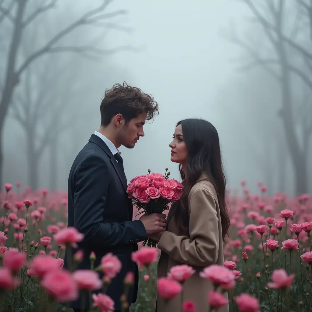 شخص يعطي ورد لحبيبته ، في مكان هادئ وضبابي ، وحوله الكثير من الازهار الوردية وامامه حبيبته في ردة فعل خجولة