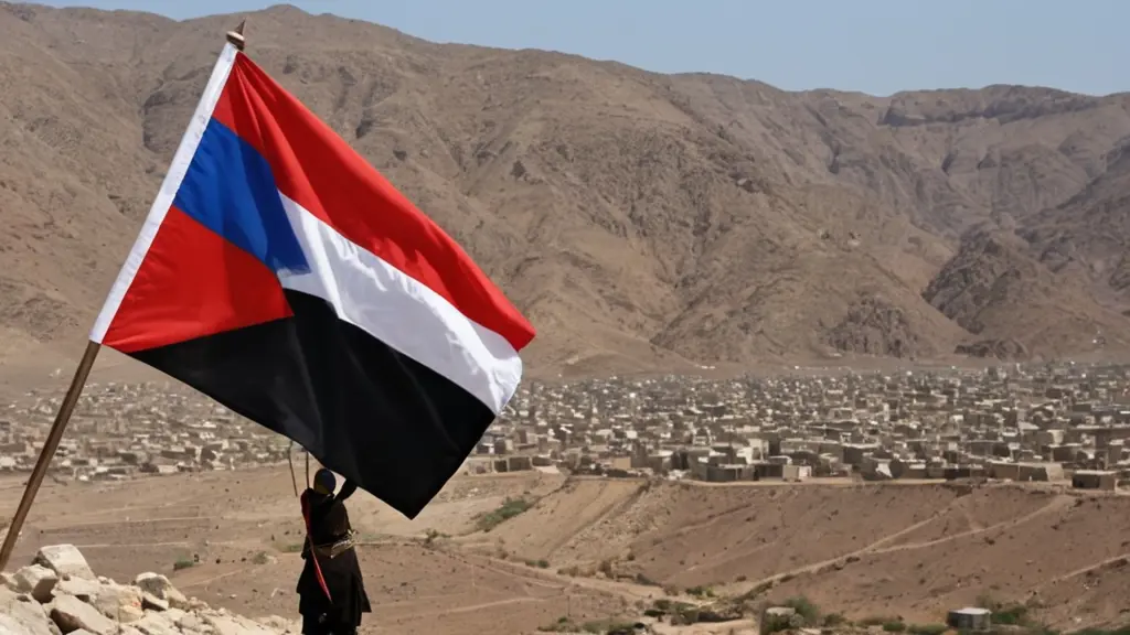 يمني جنوبي يرفع علم الجنوب  ازرق مثلث احمر ابيض اسود نجمه حمراء داخل المثلث الازرق
