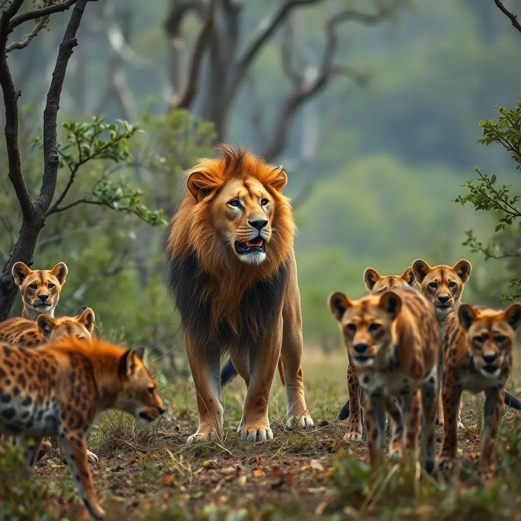 صوره اسد في الغابه وسط ضباع