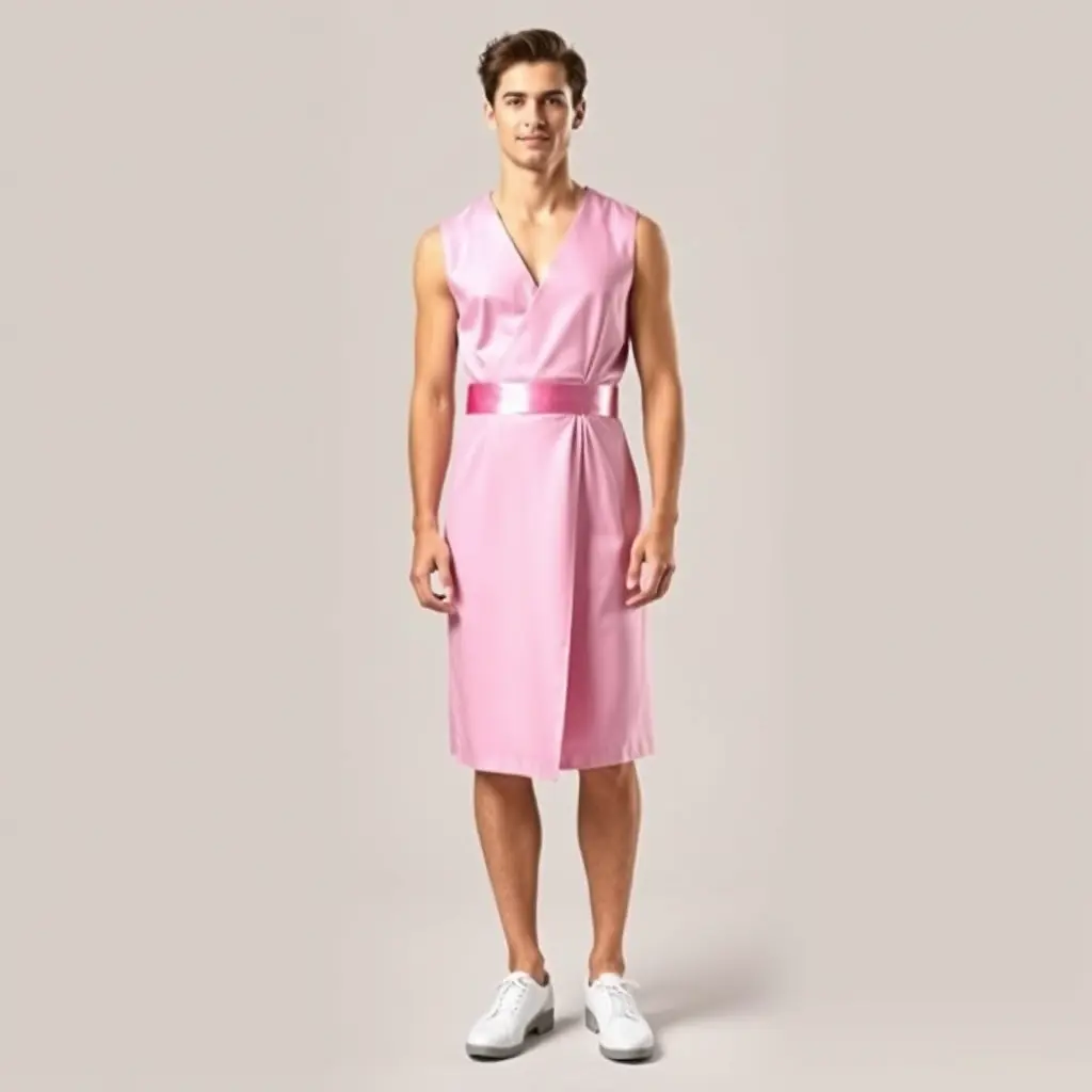 رجل لابس فستان زهري وركز انه فستان وليس لباس زهري فقط ويكون مخصر الفستان ولامع واجعله واسع واظهر كامل الجسد واريد صوره اخرى لتوره قصيره وتذكر اني اريده على رجل لا على امرأه