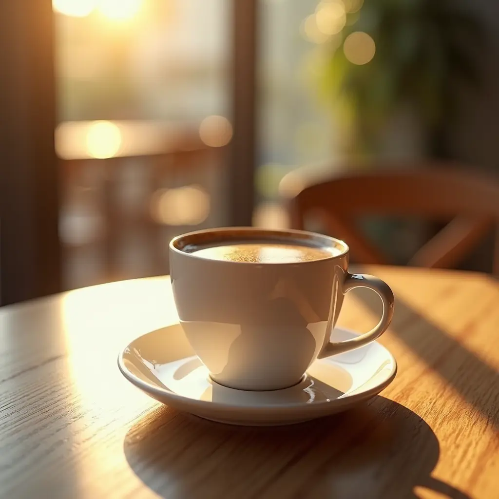 كوب قهوة عل طاوله مع تأثير اشعة الشمس ودقه عاليه جداً 8k