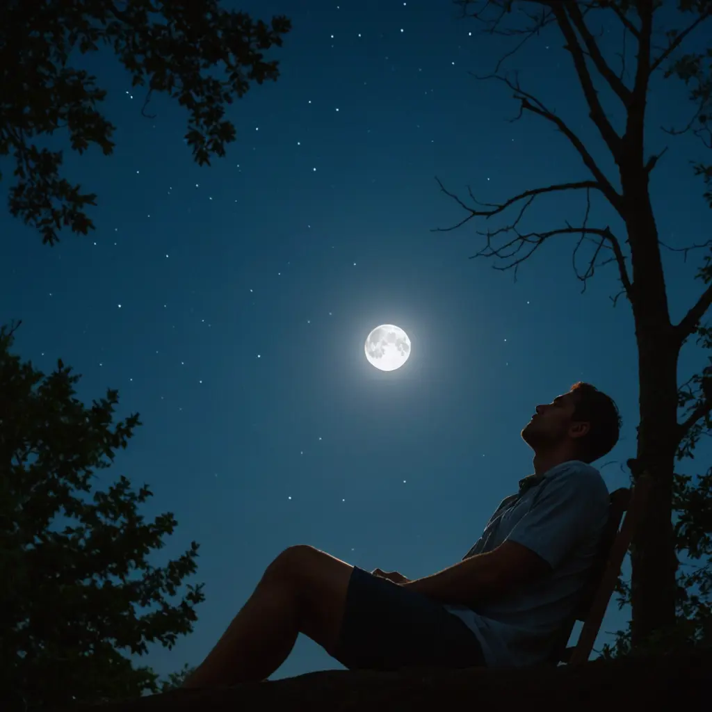 انسان ينظر للقمر وهو جالس بالليل ويوجد أشجار وقمر ساطع ونجوم ونائم علي ظهره ويديه تحت راسه