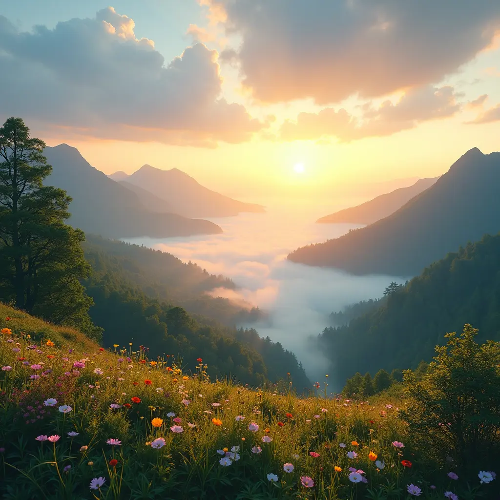 منظر طبيعي خلاب عند شروق الشمس، بجبال ضبابية تغمرها أشعة ذهبية، وسماء زرقاء صافية. تحيط بهذا المشهد وديان خضراء يانعة وأزهار برية زاهية، على خلفية تلال متدحرجة تزينها غابات عتيقة. هذه البيئة الهادئة تبعث على السكينة، مُجسّدة بأسلوب لوحة رقمية بألوان ناعمة ودافئة وتفاصيل دقيقة.