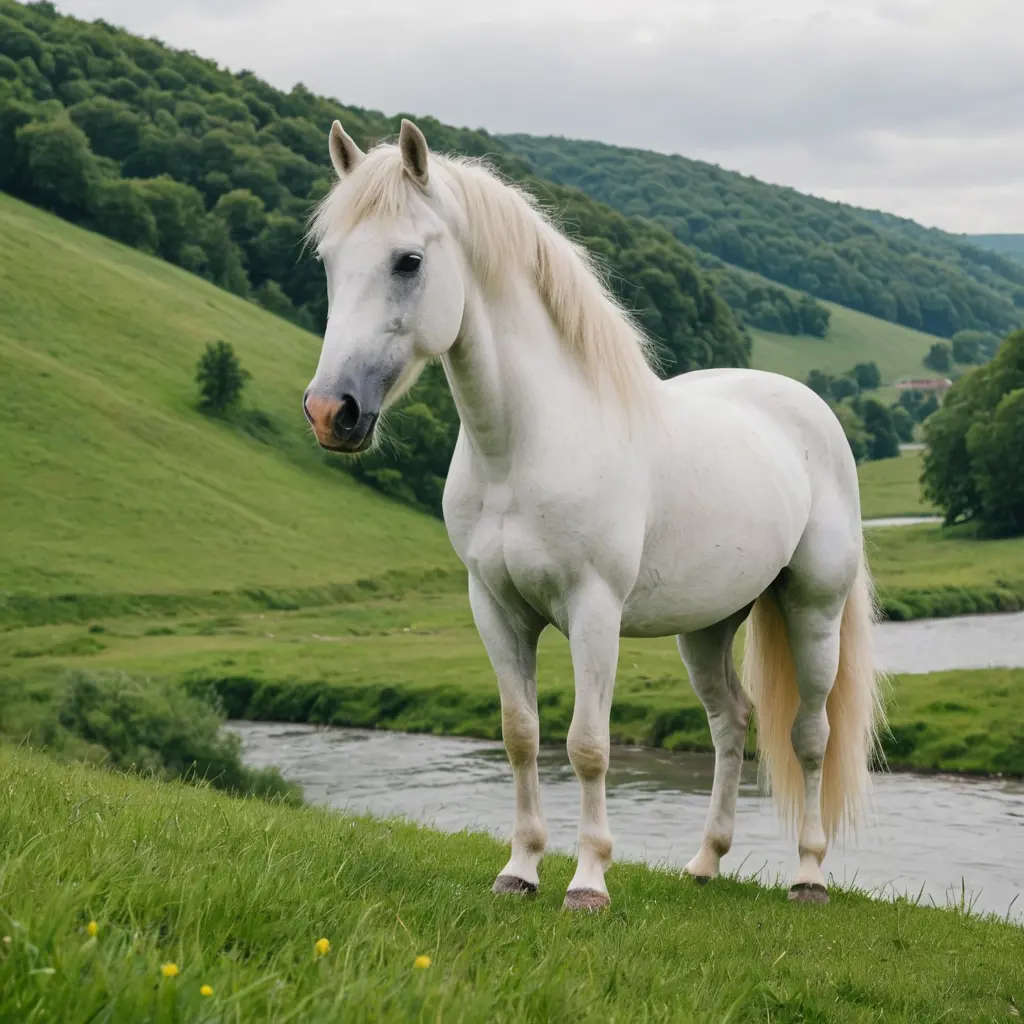 صوره حصان اصيل ابيض يقف على تله خضراء جانب نهر