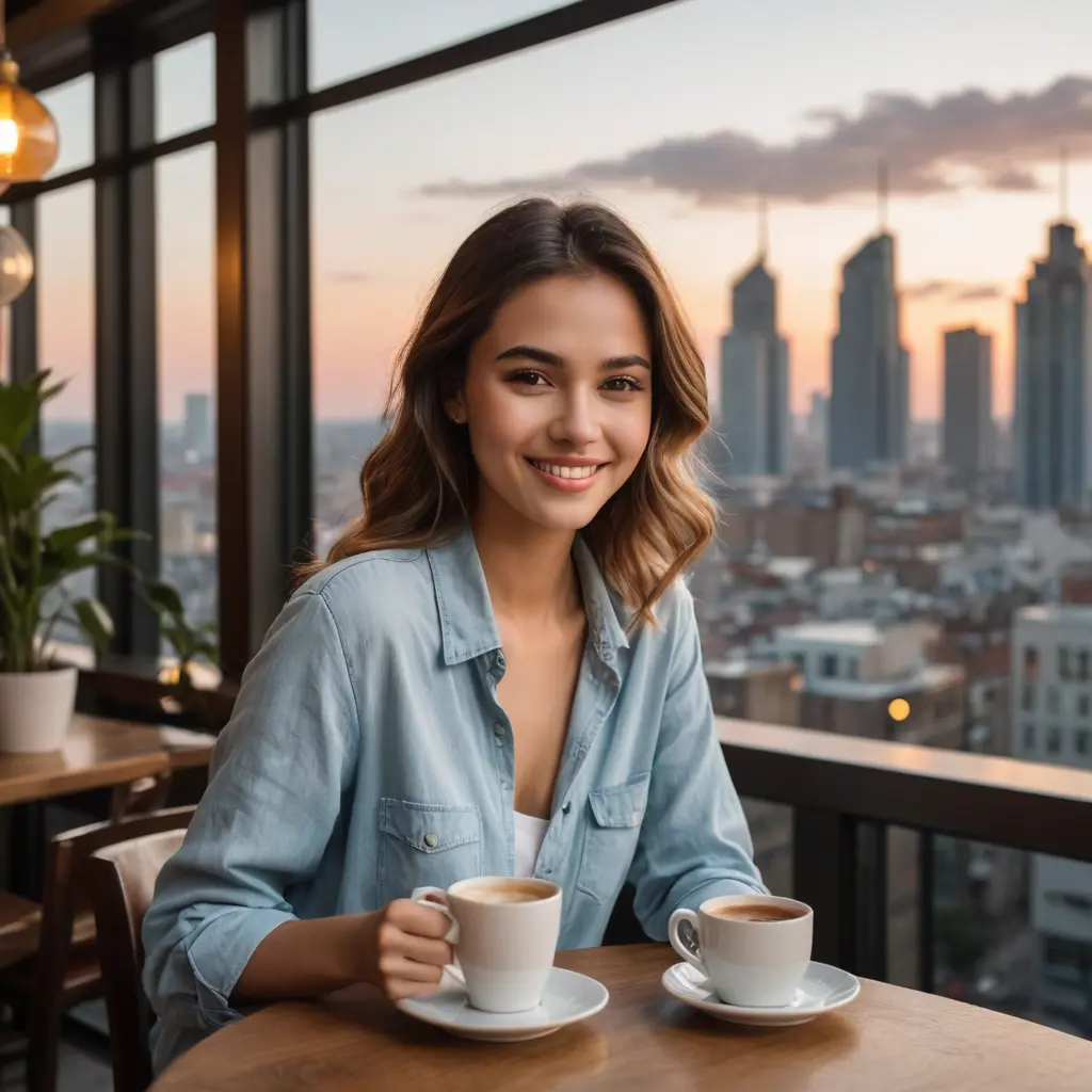 一位年轻漂亮的女生,她坐在高楼的咖啡厅桌上,窗外的背景是高楼大厦和云朵和晚霞或者夕阳或星空。身穿华丽但整洁的衣物,脸上洋溢着微笑右手撑着脸颊。她在咖啡厅享受着一杯咖啡,。玻璃窗外的建筑高耸且繁华,突出城市的多样性和活力。