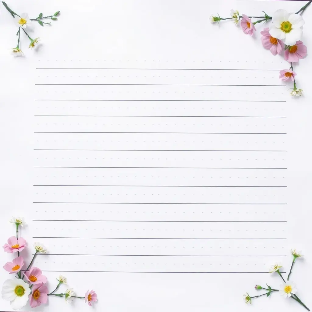 صفحه بيضاء بها اسطر كثيره سوداء بالعرض لي الكتابه عليهااللون مزينه بي إطار من الزهور الصغيره