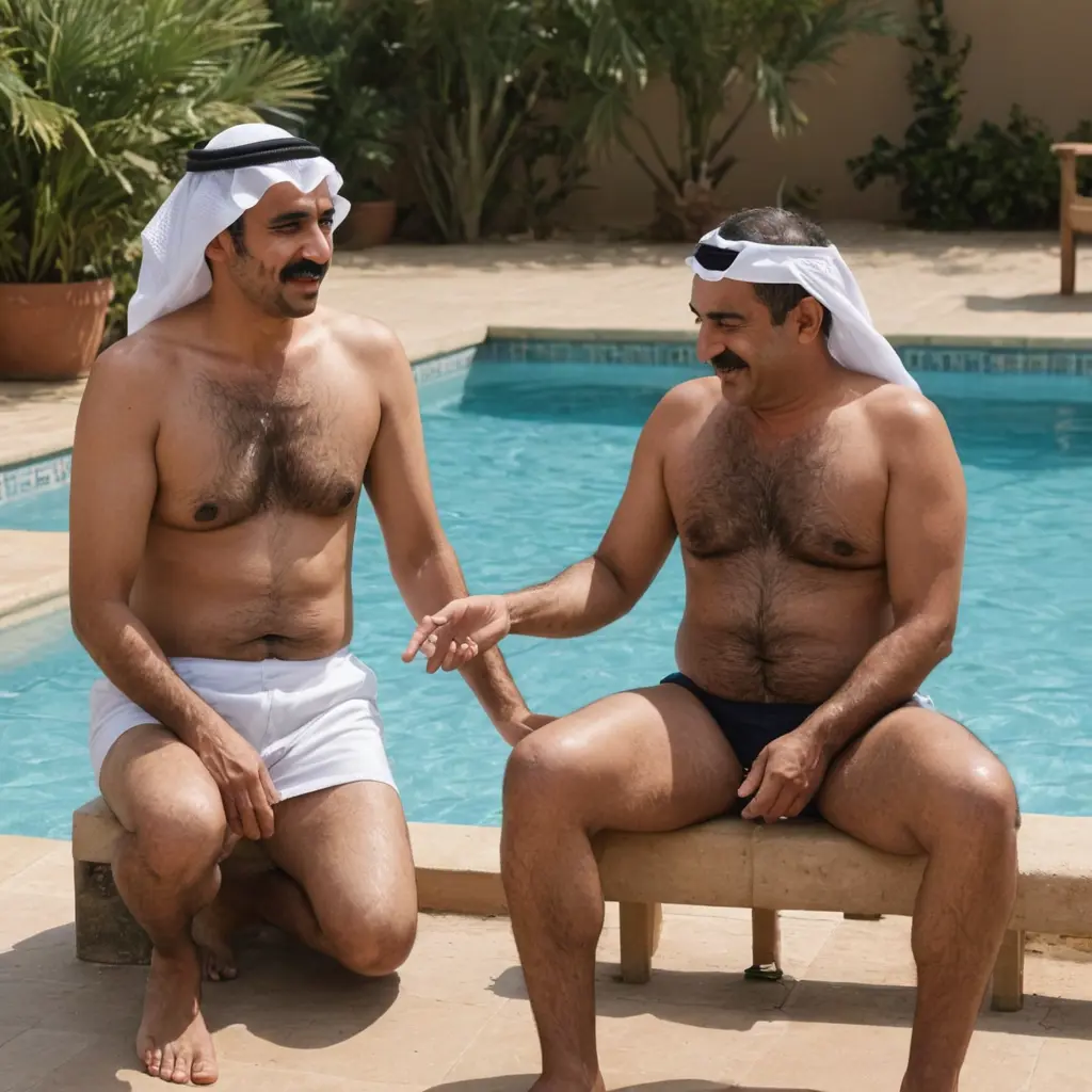 رجل خمسيني سعودي لابس كلسون وجالس في حمام السباحه ورجل يعمل له مساج