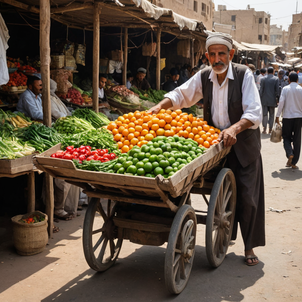 رجل يمني كبير في السن يبيع خضار وفواكه في عربية نقل يدويه قديمة في سوق شعبي يمني
