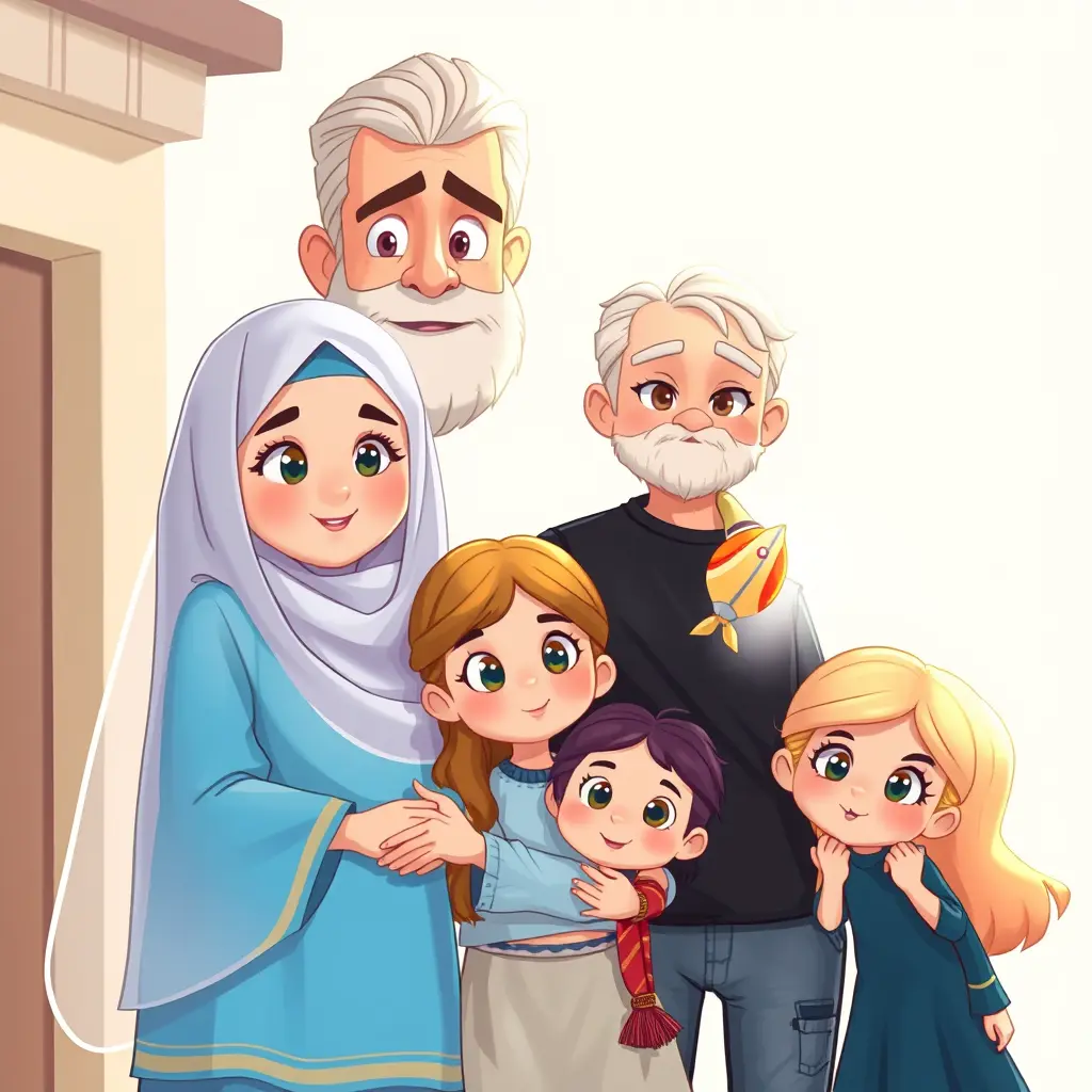 صورة كرتونيةأم محجبة بفستان أزرق وحجاب أبيض، والأب طويل بلحية خفيفة وبشرة حنطية، لابس قميص أسود وبنطلون جينز، ومعهم البنات بعمر 10، 8، و3 سنوات، الجو عائلي دافئ والعيون مفتوحة واقعيه اكثر من هاكذا