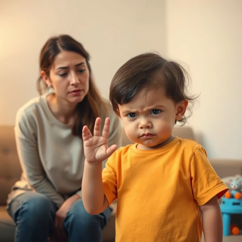 المشهد: أم في منتصف العشرينات تبدو مرهقة لكن بتحاول تتكلم بهدوء، وفي مواجهتها طفل (عمره حوالي ٣ سنين) عابس ورافع إيده وكأنه بيقول "لأ" أو مش راضي يسمع كلامها. الخلفية: جو بيت بسيط ومرتب (كنبة، طاولة صغيرة، ألعاب متناثرة خفيفة توحي بوجود طفل)، الإضاءة دافئة وهادئة توصل مشاعر يومية من قلب البيت. ألوان الملابس: الأم لابسة لبس بيت بسيط بلون هادي (زي اللبني أو البيج). الطفل لابس تيشيرت بلون واضح (برتقالي فاتح أو أصفر) يلفت النظر ويعبر عن سنه. تعابير الوجوه: الأم: نظرة صبر وهدوء لكن فيها شوية قلق. الطفل: عنيد، راسم على وشه ملامح الرفض. --- 💡 ملاحظات إضافية: بدون أي كتابة على الصورة. الصورة تكون مربعة (مقاس 1080x1080 بكسل) عشان تنفع للفيسبوك وإنستجرام. توصل إحساس الصراع اليومي اللي بتمر بيه كل أم في المرحلة دي، لكن بدون مشهد عنيف.