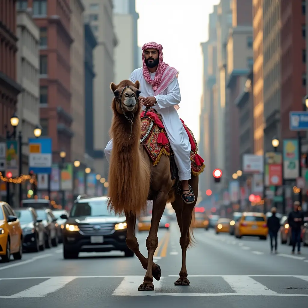 صورة رجل بدوي يركب الجمل في وسط شوارع نيويورك