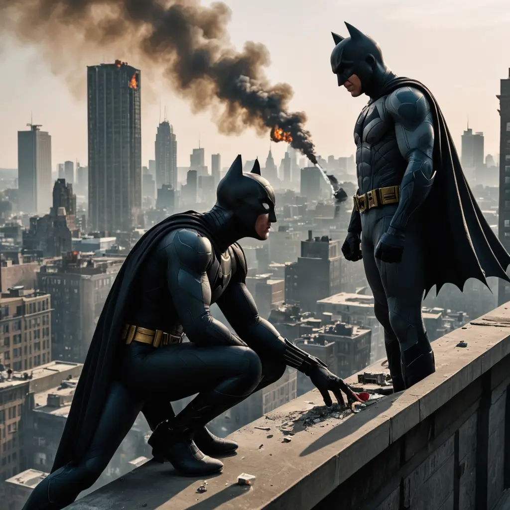 سبايدرمان وباتمان يشربان سجائر اعلا بنايه وينظران الي مدينه وهيه تحترق وتدمر