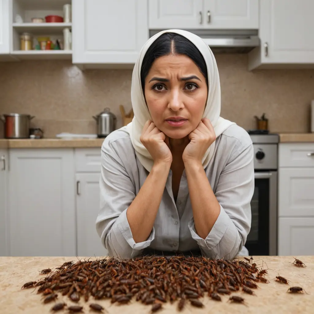 امرأه عربية لابسة لبس محتشم منزعجة ومتضايقة من الصراصير والفئران والنمل في المطبخ