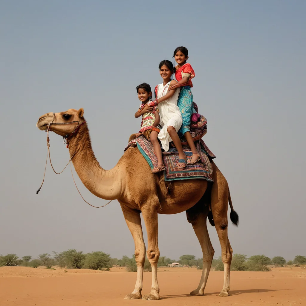 جمل واحد يحمل امراء  واحدة وطفل واحد  راكبين فوق الجمل