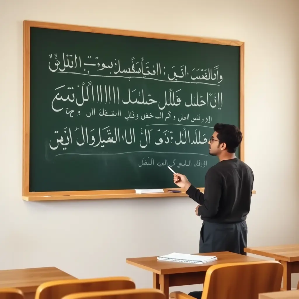 صورة معلم في الفصل بيعلم اللغة العربية وعلى السبورة حروف عربيبة