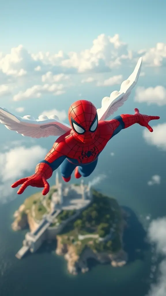 سبايدر مان طاير فوق جزيرة مثل الملائكة بس يكون شبه الليجو وخلى الصورة كارتونيه شوية