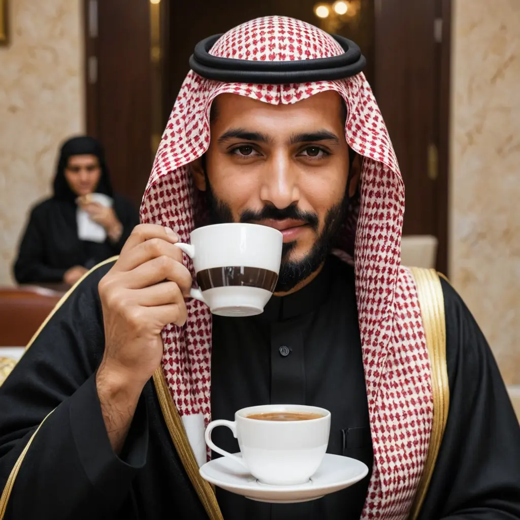 رجل سعودي يشرب قهوه والصوره كلها مغطاه باالون الاسود