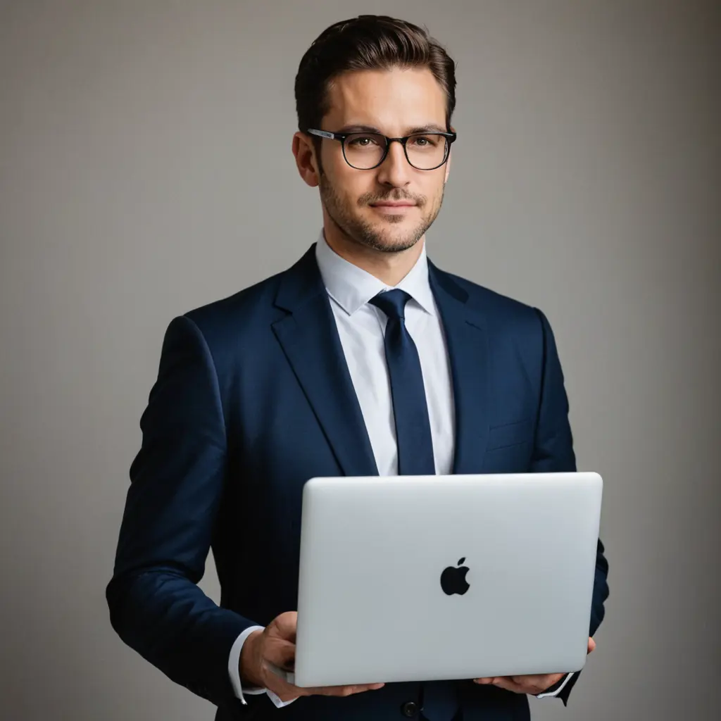 رجل يرتدي نظاره ويلبس بدله وماسك لاب توب