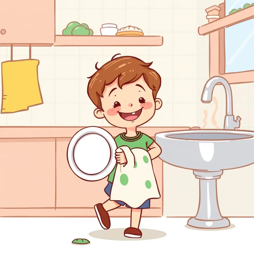 A cartoon  A smiling child carrying dirty plates to the sink with a dish towel in hand.