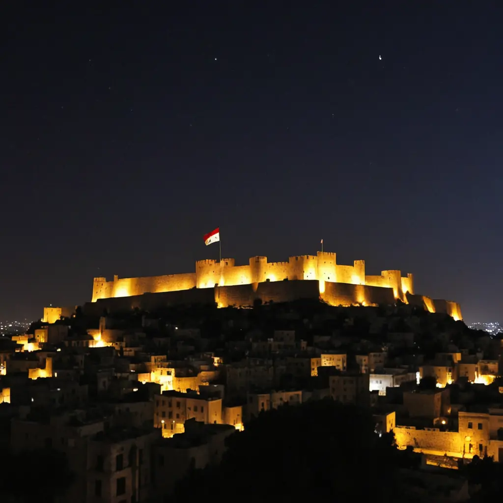 صورة لقلعة حلب مع العلم السوري الجديد في الليل