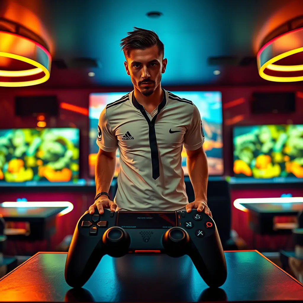صورة للاعب كرة القدم الشهير روبرت ليفاندوفسكي، يقف بثقة على جهاز ألعاب عصري أنيق، يستعد للانضمام إلى مباراة في لعبة الفيديو الشهيرة PUBG (ساحات معارك اللاعبين المجهولين). المكان عبارة عن صالة ألعاب راقية بأضواء نيون زاهية وشاشات كبيرة تعرض أحداثًا سريعة الوتيرة. تتميز الصورة بأسلوب سينمائي، يجسد التركيز الشديد على وجه ليفاندوفسكي والخلفية الملونة لخريطة PUBG. الإضاءة حادة وديناميكية، تُبرز بنيته الرياضية وتفاصيل الجهاز.