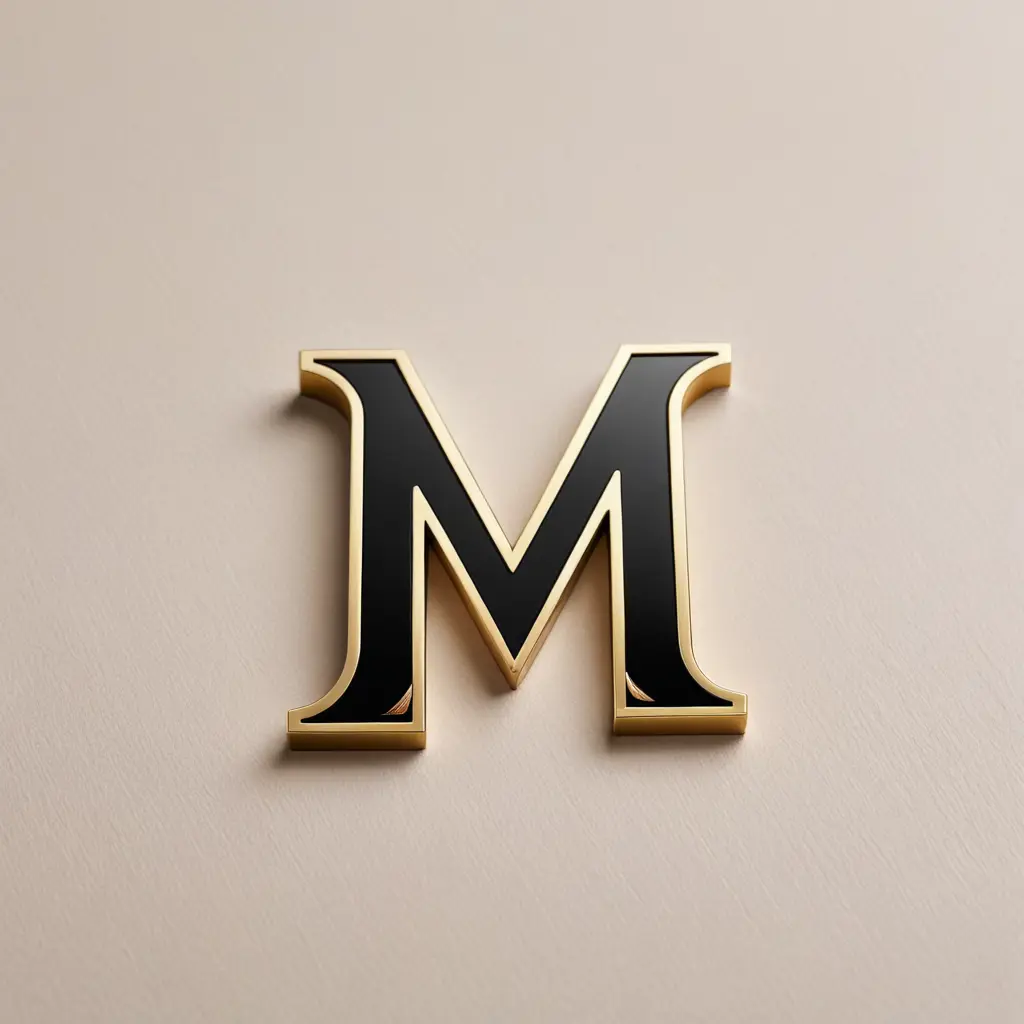 شعار أنيق لماركة أزياء بحرف M، بلمعة ذهبية وسوداء، بمظهر فخم وعصري