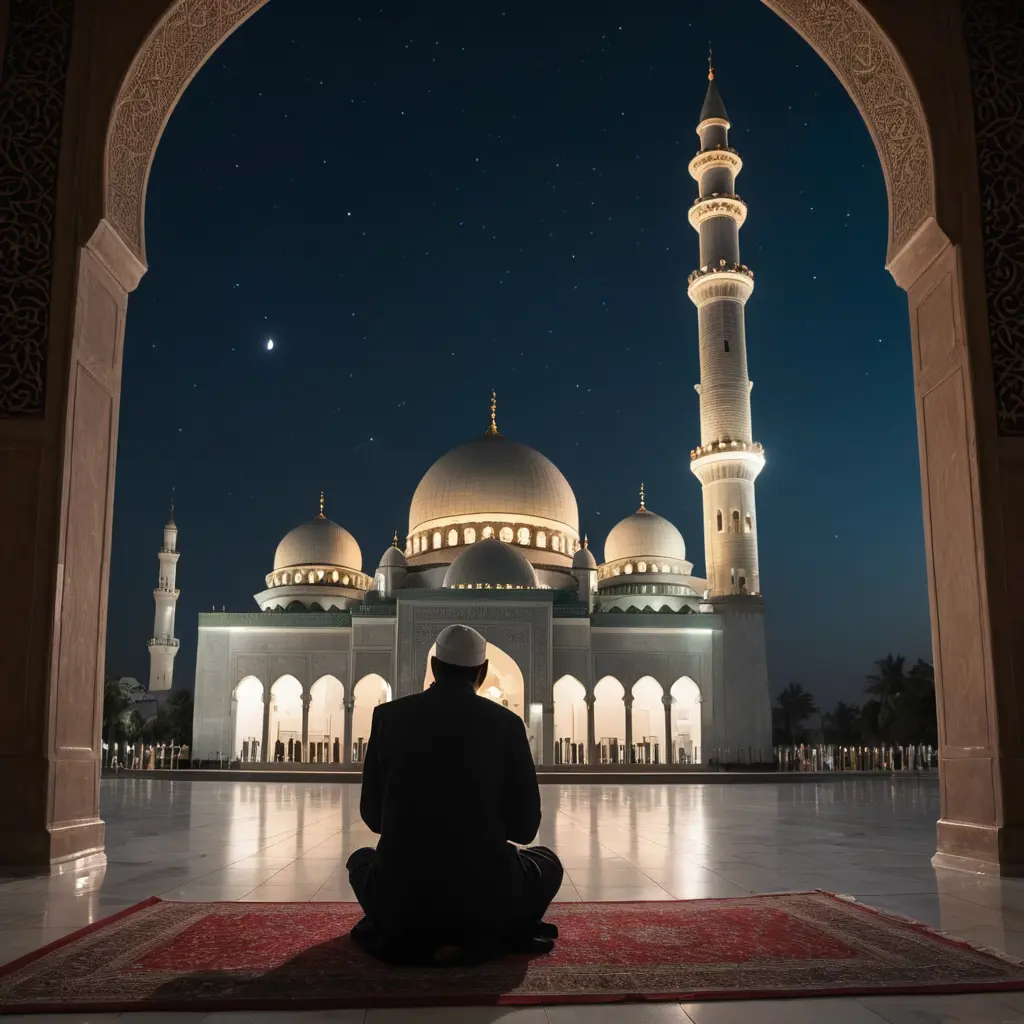 صورة مسجد بداخله مصلي يدعوا الله في وقت الليل بدخله مصمم Vedio editor