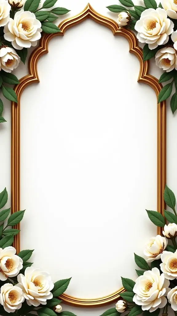 Ornate double-page wedding frame design in luxurious Arabic–Islamic style. Elegant floral decorations with white and gold flowers, green leaves, and pearl accents on both sides. Rich embossed gold borders and curved decorative corners. Symmetrical composition with a blank white center area on each page for custom text or photos. Elegant, royal, and high-end design suitable for wedding invitations or fingerprint guest book art. High resolution, soft lighting, no names or shapes inside the white areas.