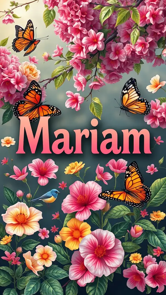 عنوان اسم Mariam مع الوان البستان الزاهية وفراشات وزهور وطيور