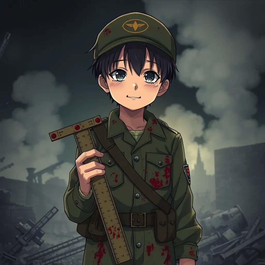 جندي أنمي شاب يرتدي زيًا عسكريًا متسخًا بالتراب والدماء، يحمل مسطرة مهندس على شكل حرف 'T' في يده اليمنى، ويقف في ساحة معركة مدمرة. تظهر على وجهه ابتسامة حزينة ودموع تنهمر من عينيه، بينما تتصاعد سحب الدخان في الخلفية وتتناثر الأنقاض من حوله. الإضاءة خافتة تعكس جوًا دراميًا، مع ألوان داكنة تبرز تفاصيل المشهد