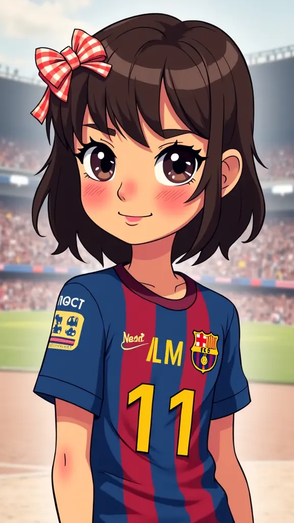 صورة فتاة كرتون ترتدي قميص نادي برشلونة و مكتوب أمام الصورة اسم alma مع زخرفة