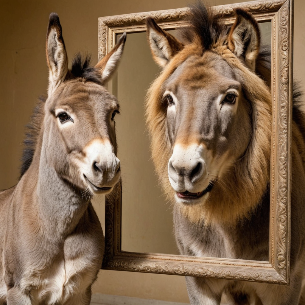 ولد صورة لحمار ينظر الي نفسه في المرآة فيري نفسه اسد مع جعل الحمار ينظر الي المرآة وجعل الصورة التي في المرآة لاسد حقيقي