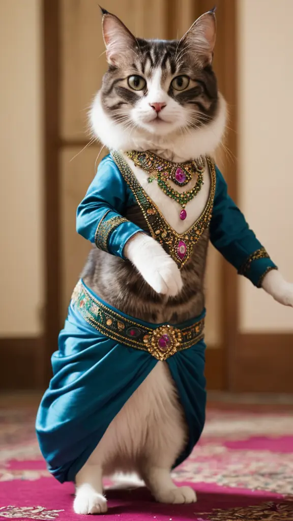 قطة ترتدي بدلة رقص شرقي  مثل سامية جمال او تحية كاريوكا تقف مستعرضة انوثتها الفتانة