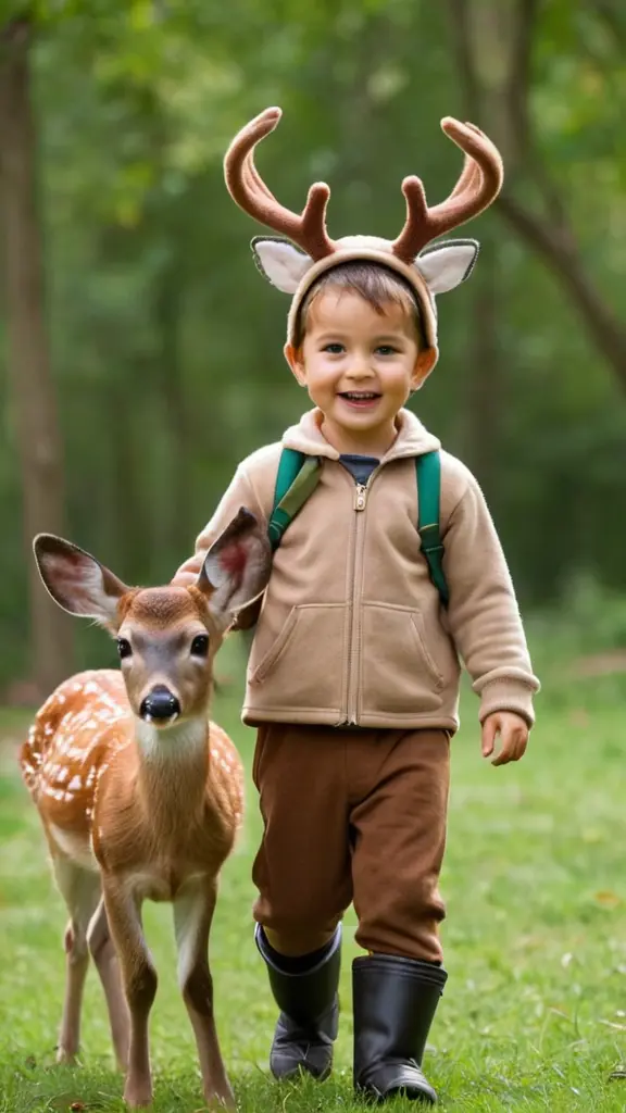 صورة طفل صغير مبتسم يرتدي زيًّا يشبه الغزال، بلون بني وأذنين شبيهتين بأذني الغزالةو بجانبه، تقف غزالة صغيرة  يمشيان بجانب بعضهما تملك مظهرًا لطيفًا مع عيون كبيرة وتعبيرات ودية، وعليها جرس حول رقبتها. الخلفية تظهر ضبابية وخضراء، مما يضيف إلى الجو الريفي الهادئ للصورة.