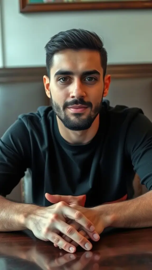 صوره شاب وسيم يجلس على الطاولة له ذقن وجه عريض سواداء ويجلس بشكل معتدل ويضع يديه على الطاوله ويتصور من الامام عربي الجنسيه بشره بيضاء