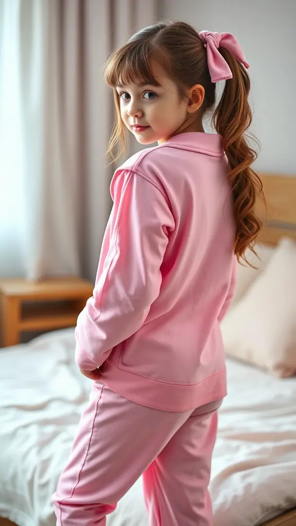بنت ترتدي بيجاما وردي بارد ديق كثيرا وهي تدير لنا بدهرها من