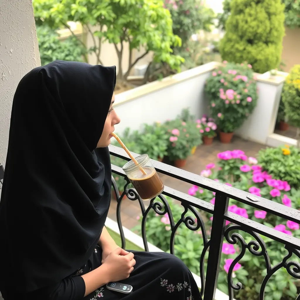 فتاة ثلاثينية  محجبة تشرب المتة بالمصاصة تجلس على بلكونة تطل على حديقة زهور