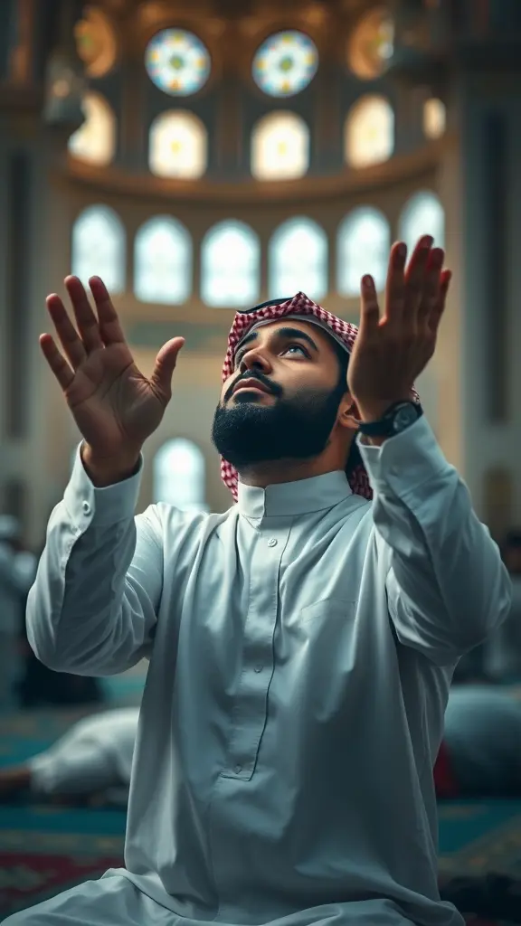 رجل سعودي يمد كفيه الى السماء يدعو الله وهو يبكي جاثيا على ركبتيه بالمسجد، تصوير عميق